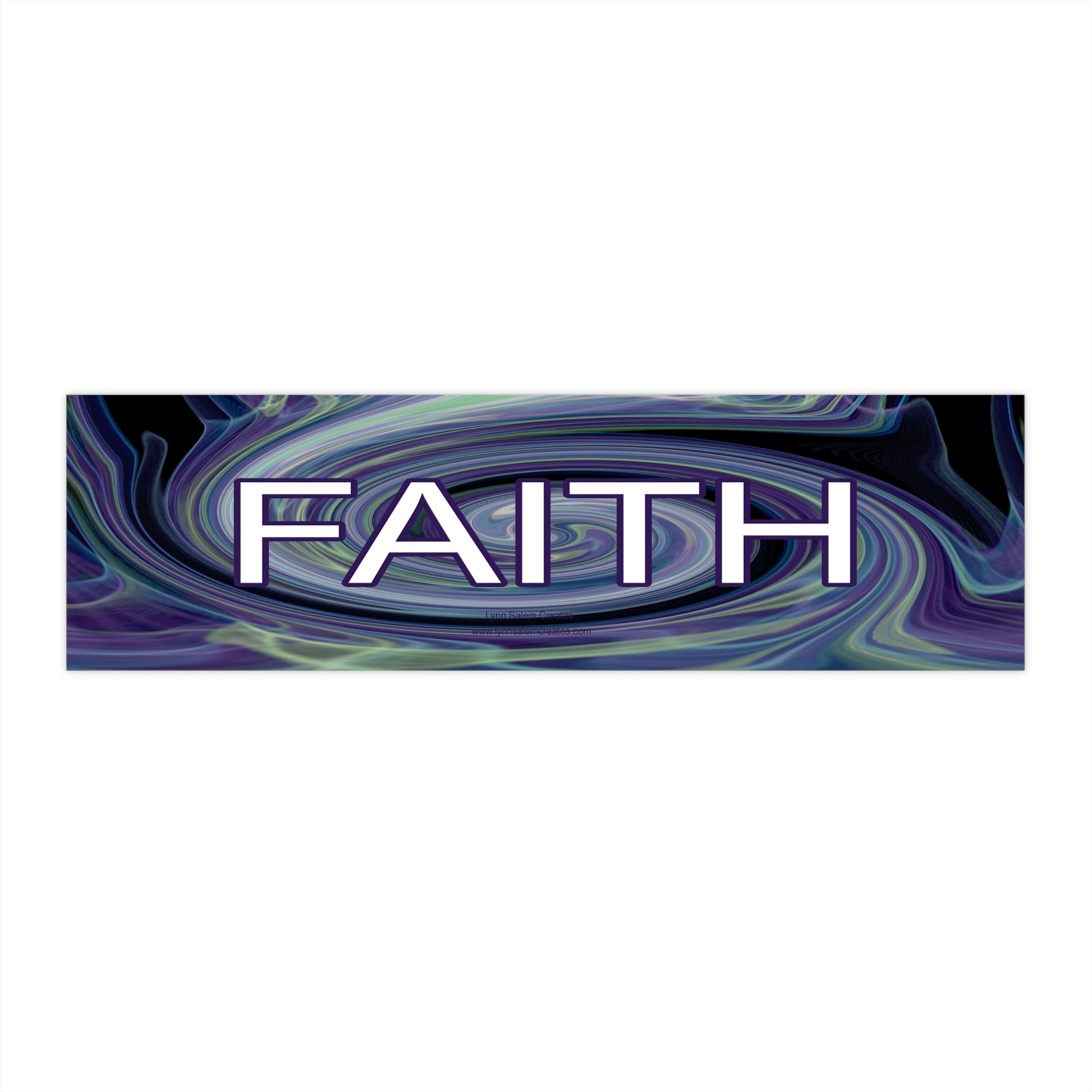 This striking bumper sticker features a dynamic swirl design crafted from an original photograph by Lynn Salem, artistically manipulated to create a mesmerizing visual. The swirl showcases vibrant hues of purples, greens, cyan, and black, blending seamlessly to evoke a sense of movement and energy. Overlaid prominently in the center is the word "FAITH" in crisp white text, outlined with a deep purple to ensure it stands out vividly against the colorful background.