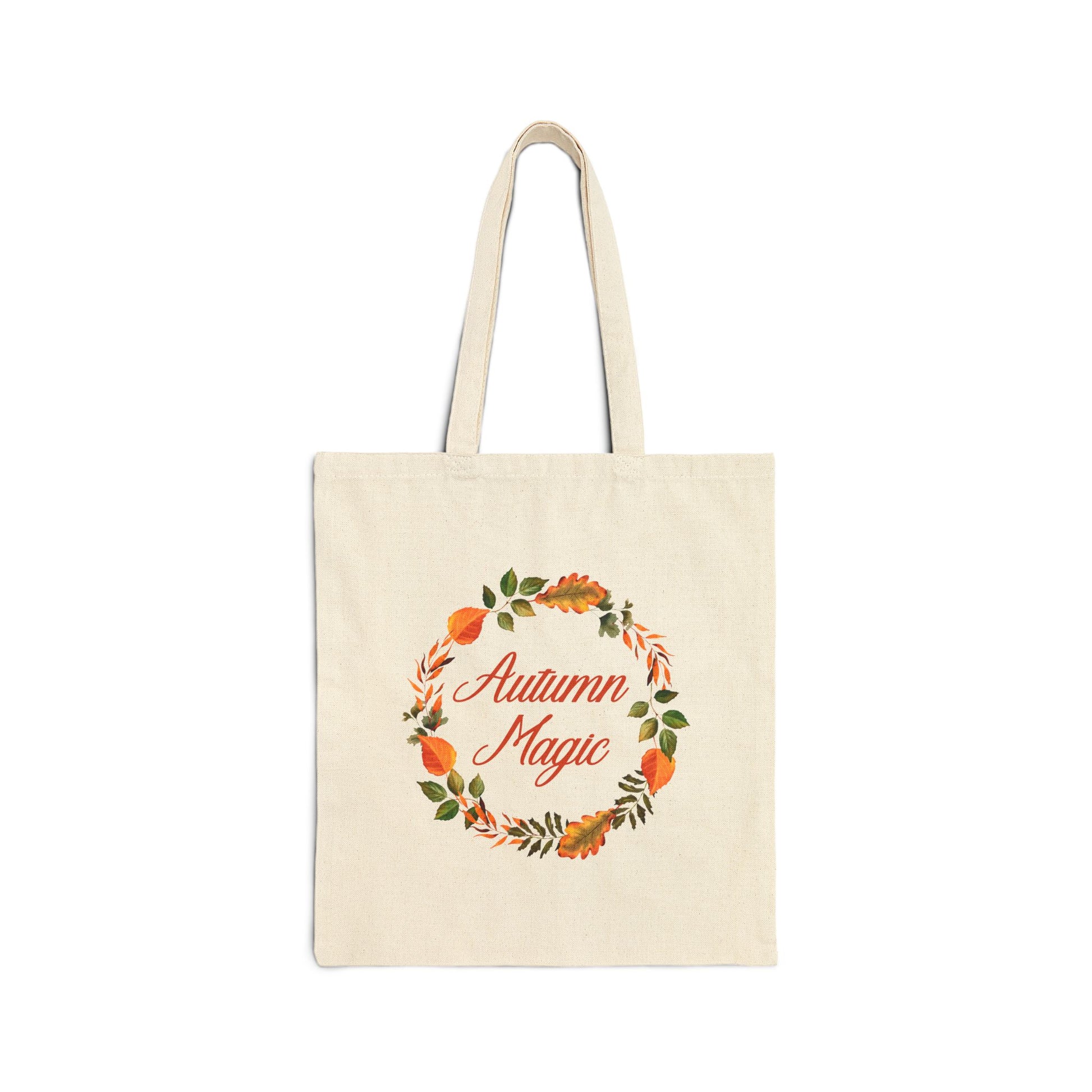 Adorned on one side with a stunning custom design, the tote showcases a beautiful wreath of fall-colored leaves that captures the essence of the season. Nestled within the vibrant wreath are the enchanting words "Autumn Magic," elegantly rendered in a striking orange hue that pops against the natural canvas background.