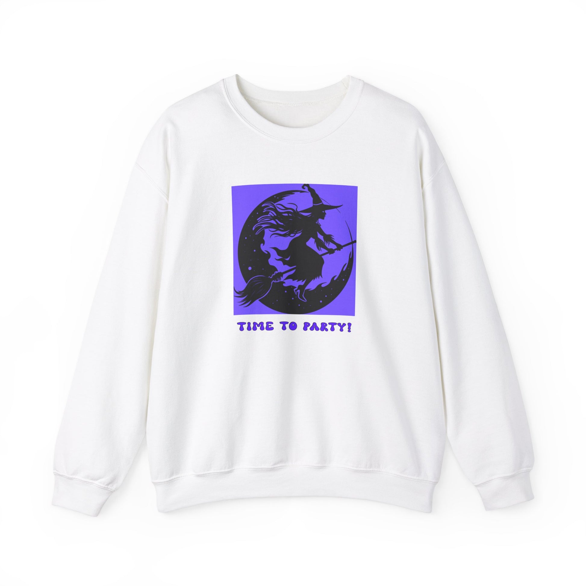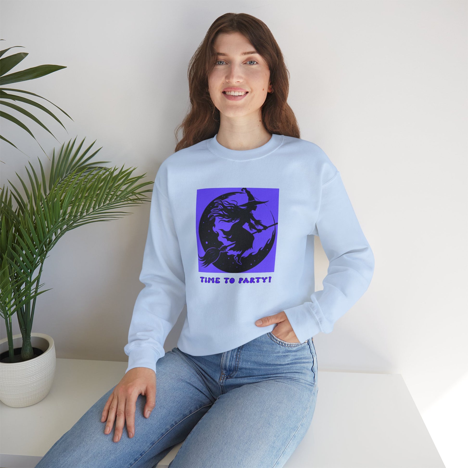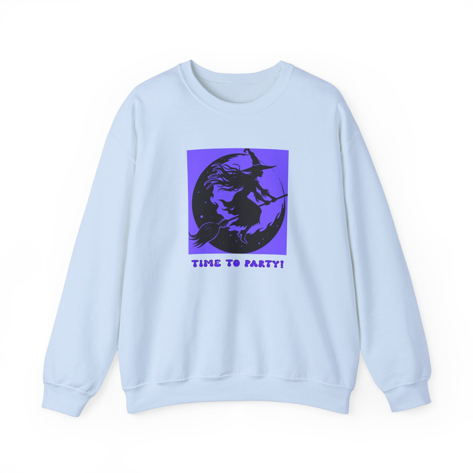 Get ready to embrace your enchanting side with my stylish unisex crew neck sweatshirt, featuring a whimsical design of a witch flying on her broomstick over a celestial crescent moon. The stunning purple sky backdrop sets the perfect tone for all your magical adventures, while the playful phrase "Time To Party!" pops in coordinating purple with a striking black outline.