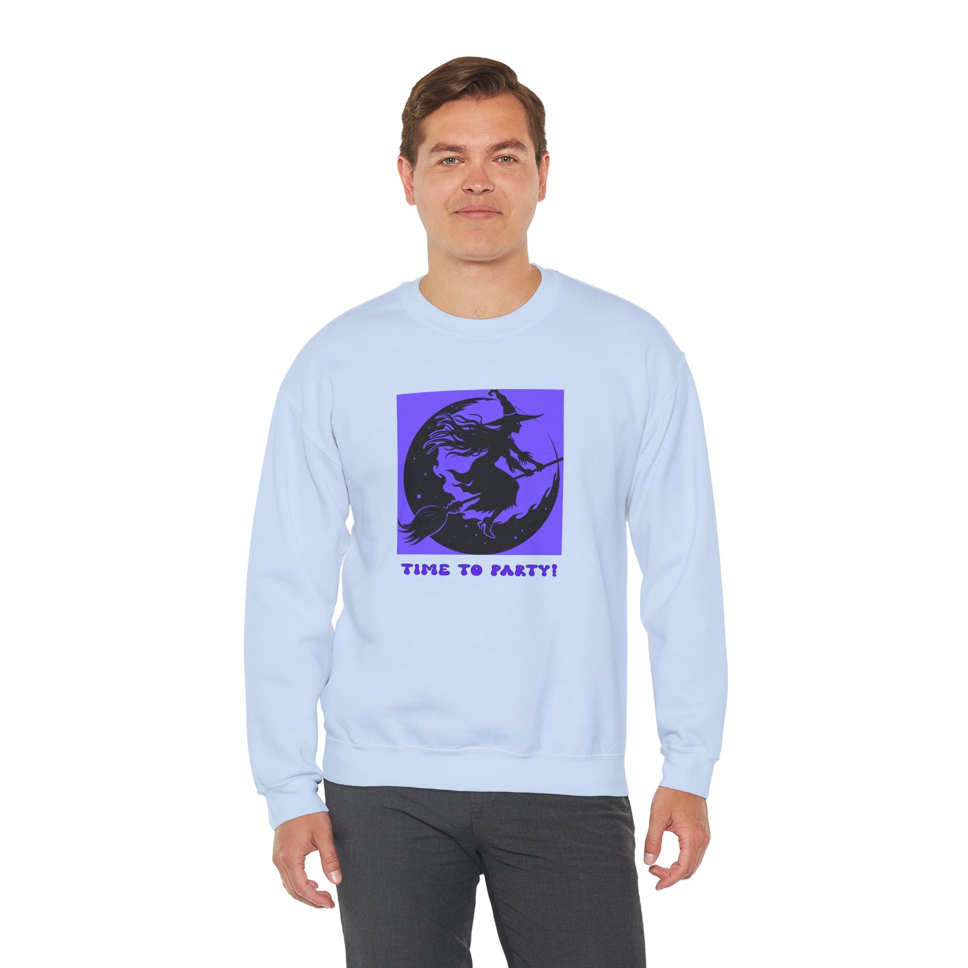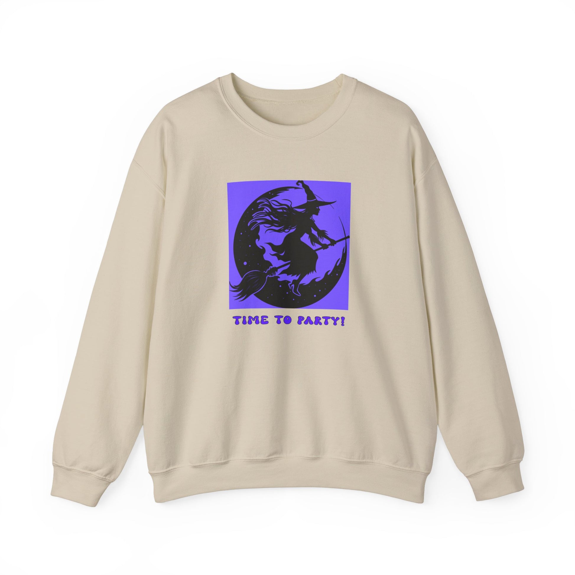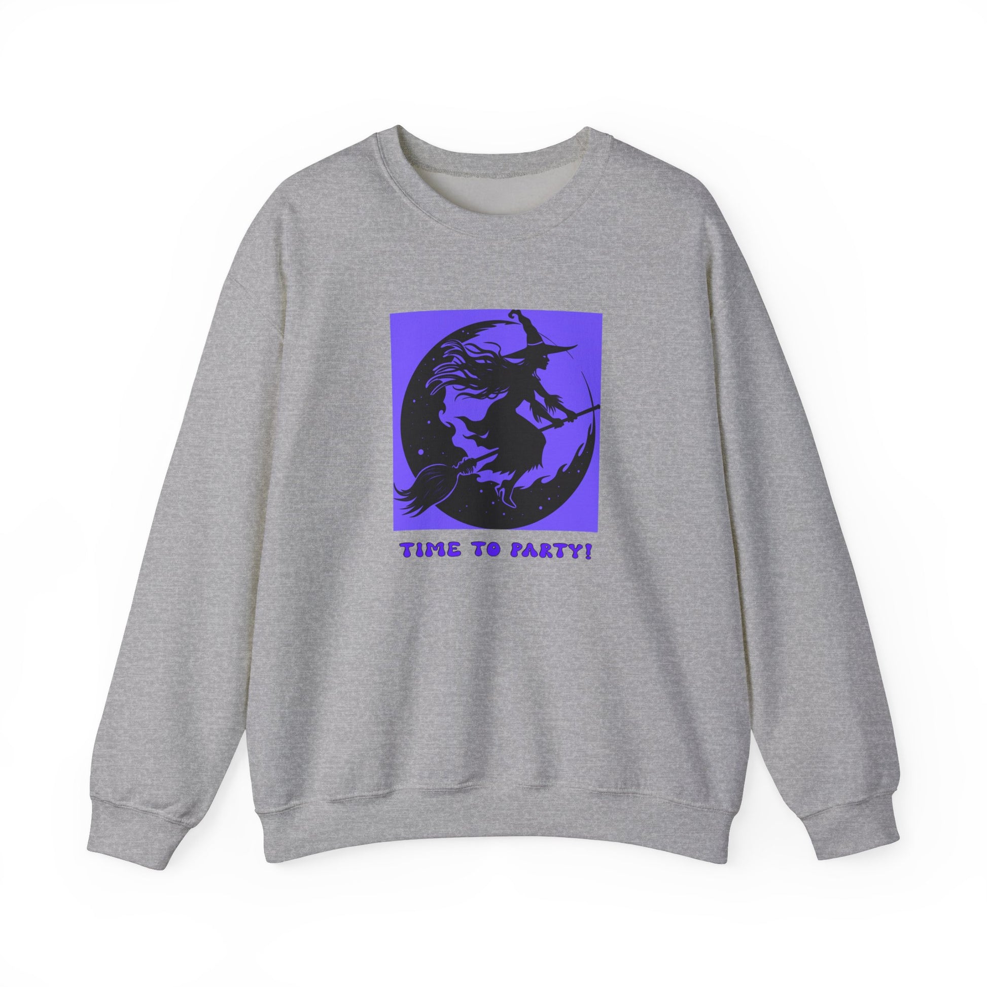 Get ready to embrace your enchanting side with my stylish unisex crew neck sweatshirt, featuring a whimsical design of a witch flying on her broomstick over a celestial crescent moon. The stunning purple sky backdrop sets the perfect tone for all your magical adventures, while the playful phrase "Time To Party!" pops in coordinating purple with a striking black outline.