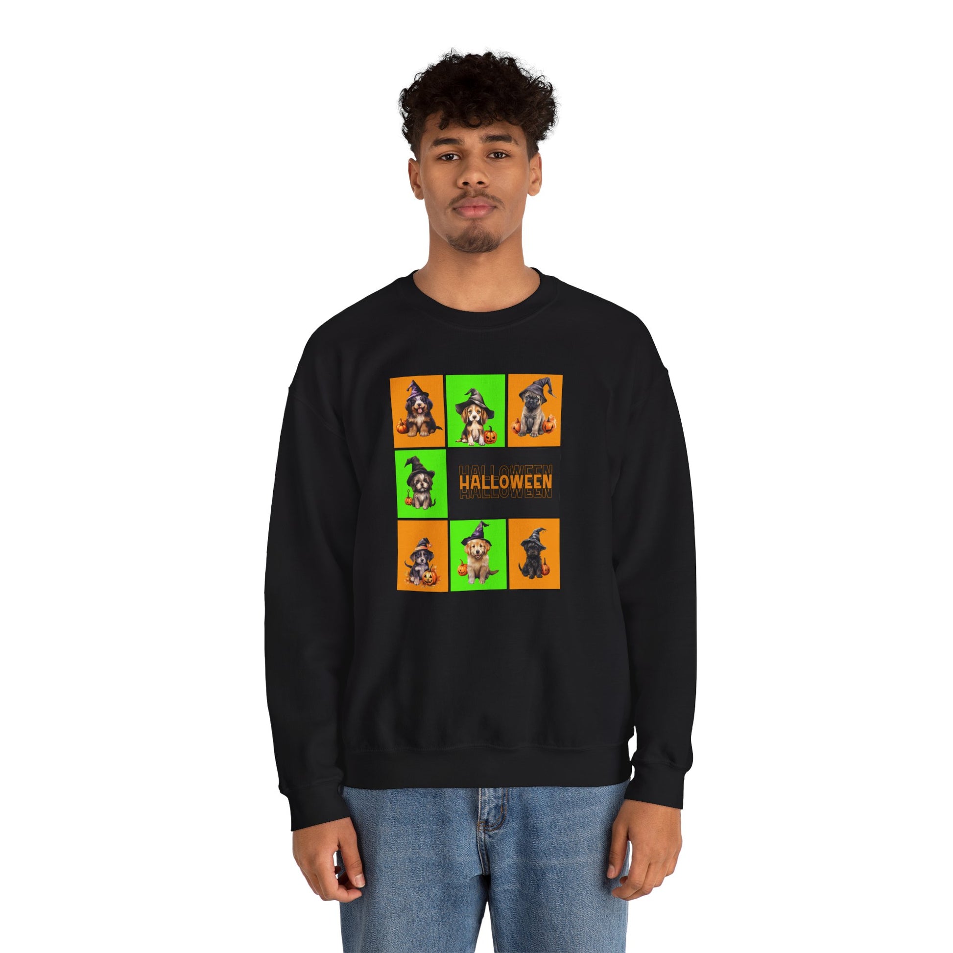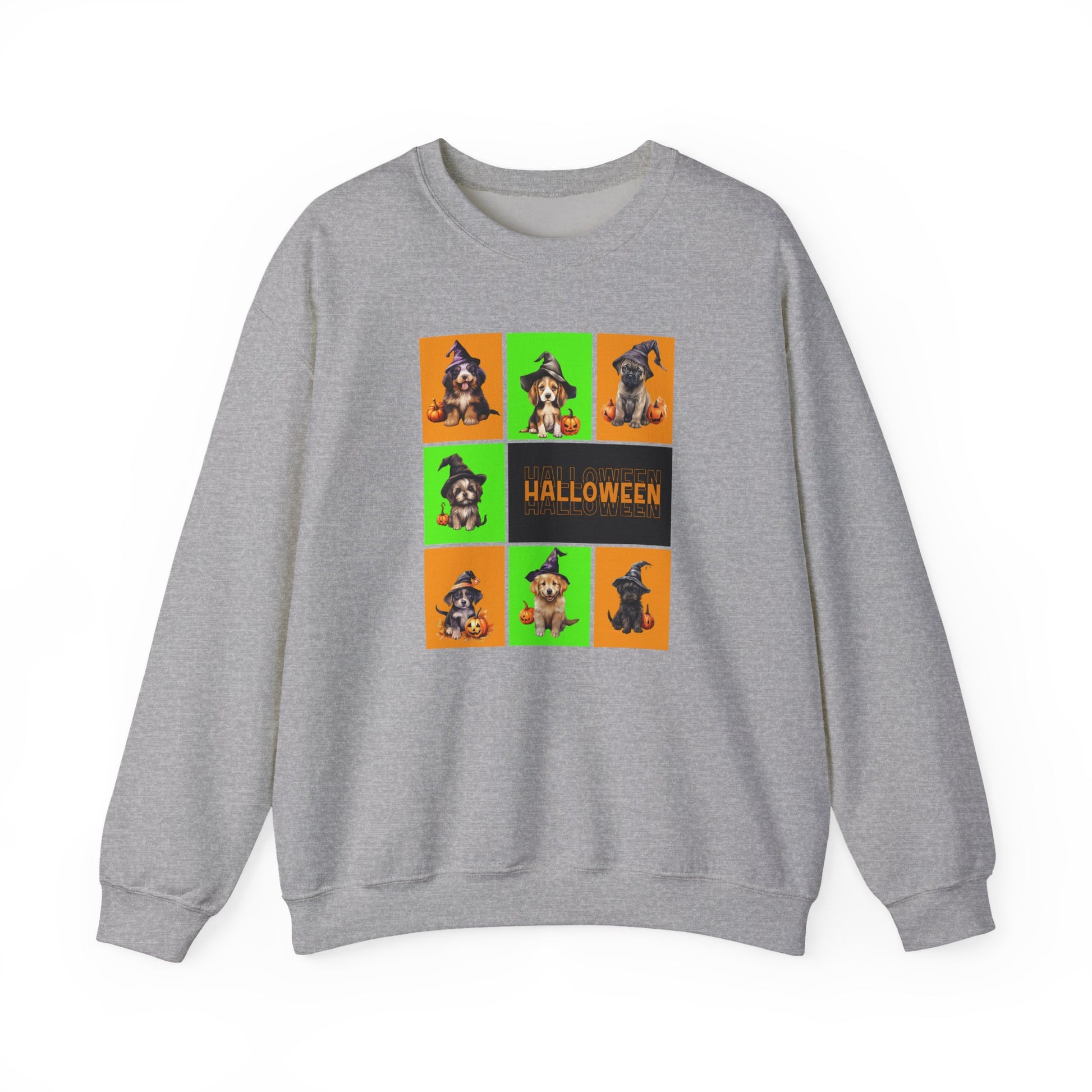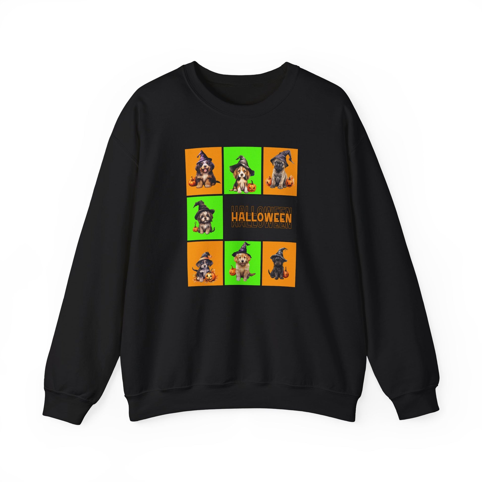 At the heart of the design, a vibrant, three-tiered text spells out "HALLOWEEN" in bold, eye-catching orange lettering, extending elegantly to the right side of the rectangle. The playful yet vibrant typography adds a lively touch to the design, balancing the cuteness of the puppies with the festive spirit of the season. This sweatshirt is available in a variety of colors and sizes, ensuring it can suit anyone’s style and preference. Whether you're looking to match with friends for a group costume or want a standout piece to showcase your love for dogs and Halloween, this unisex sweatshirt is versatile and fashionable. It’s the perfect choice for casual outings, Halloween parties, or simply cozying up at home while embracing the seasonal spirit.