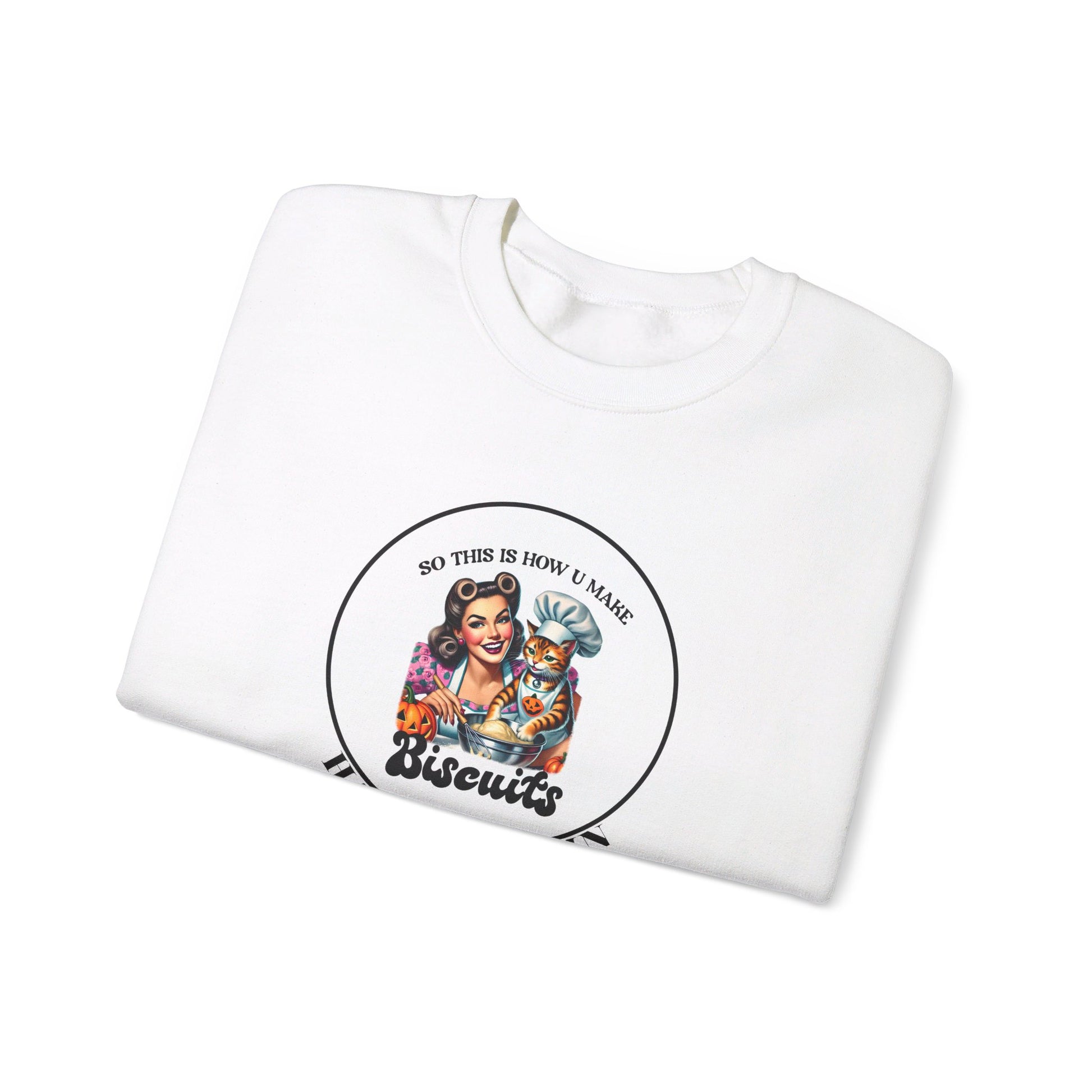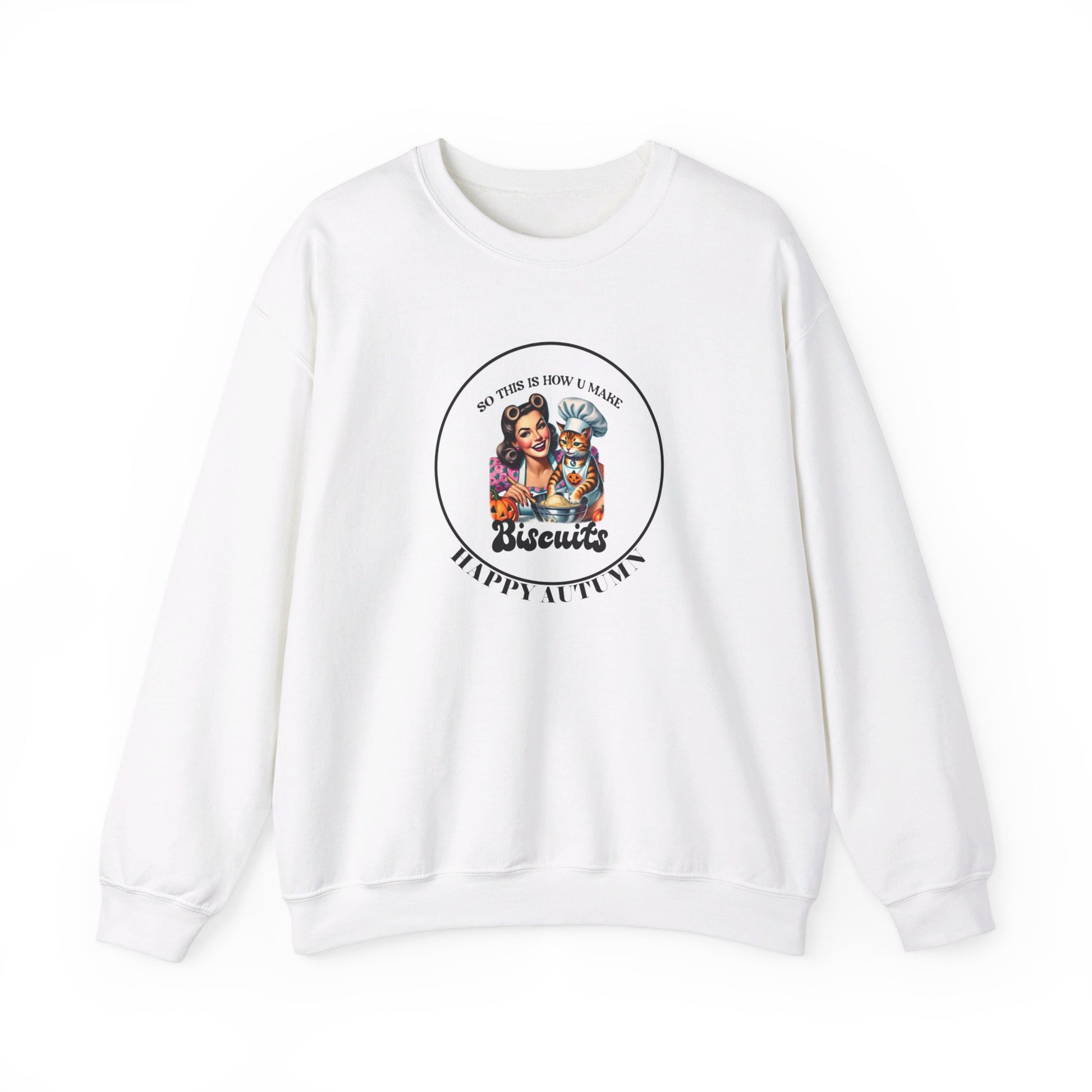 Step into the warmth and coziness of autumn with this custom designed sweatshirt. A vintage-inspired illustration of a woman smiling, surrounded by the warmth and comfort of the season, takes center stage. She's dressed in a beautiful rose motif dress, holding her adorable orange-striped cat, who's busy kneading a bowl of dough. The cat is fashionably accessorized with a pumpkin-adorned apron and chef's hat, adding a touch of whimsy to the scene. A carved pumpkin sits on the table, adding to the festive atmosphere. The quote "So this is how u make biscuits" is cleverly integrated above and below the image, creating a sense of playfulness and humor. The design is framed by a beautiful black stroke circle, with the phrase "HAPPY AUTUMN" written in elegant script below. Available in 5 colors and sizes S to 3XL, this sweatshirt is perfect for anyone who loves the cozy charm of autumn. Wear it as a statement piece or layer it under your favorite jacket - either way, you'll be sure to make a statement."