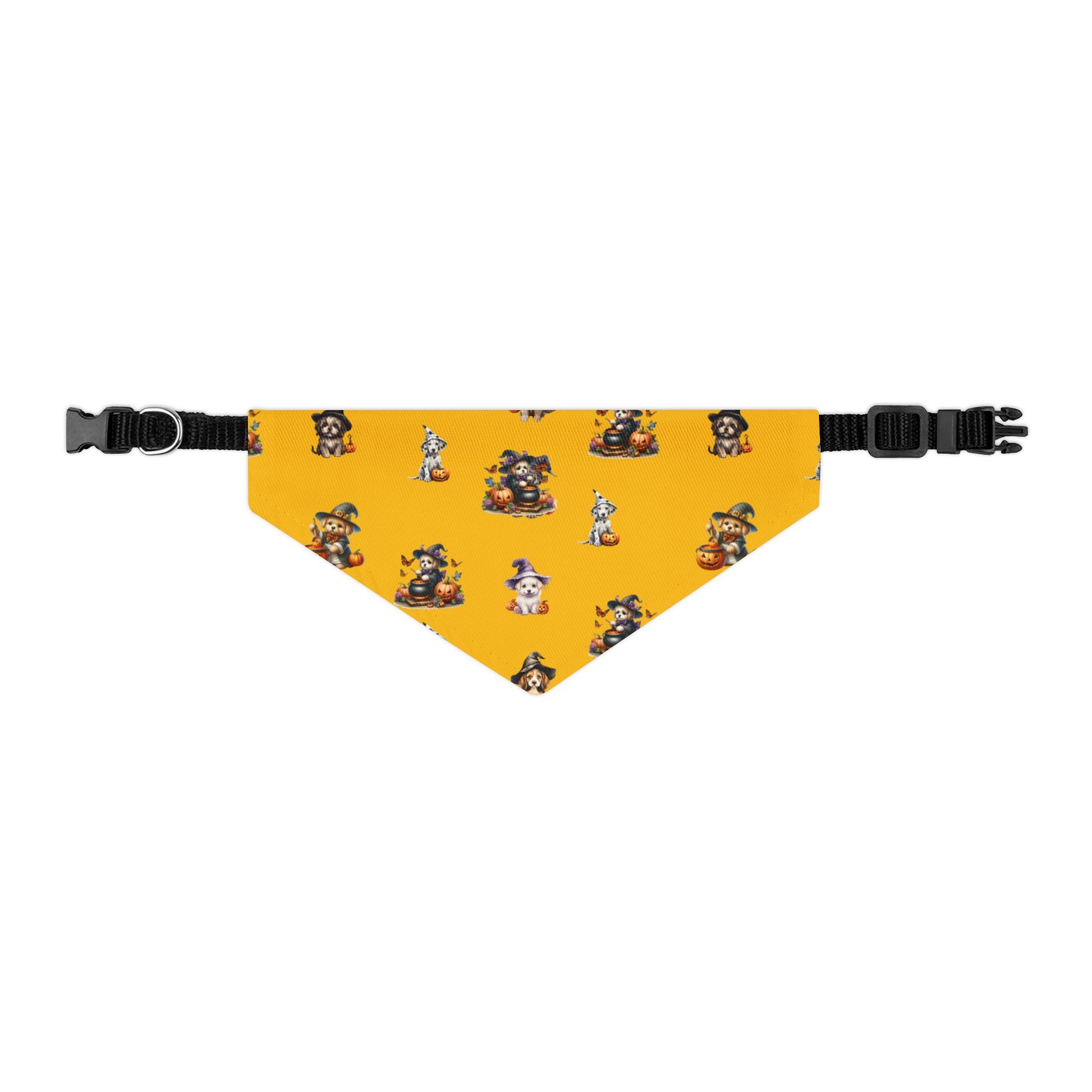 Featuring a vibrant yellow background and an adorable design of playful puppies dressed as witches surrounded by cheerful pumpkins, this bandana collar, by Lynn Salem Creates, captures the spirit of Halloween in a fun and whimsical way. Whether it’s for a festive photoshoot, a Halloween party, or just a stroll around the neighborhood, your pet will be the star of the show!