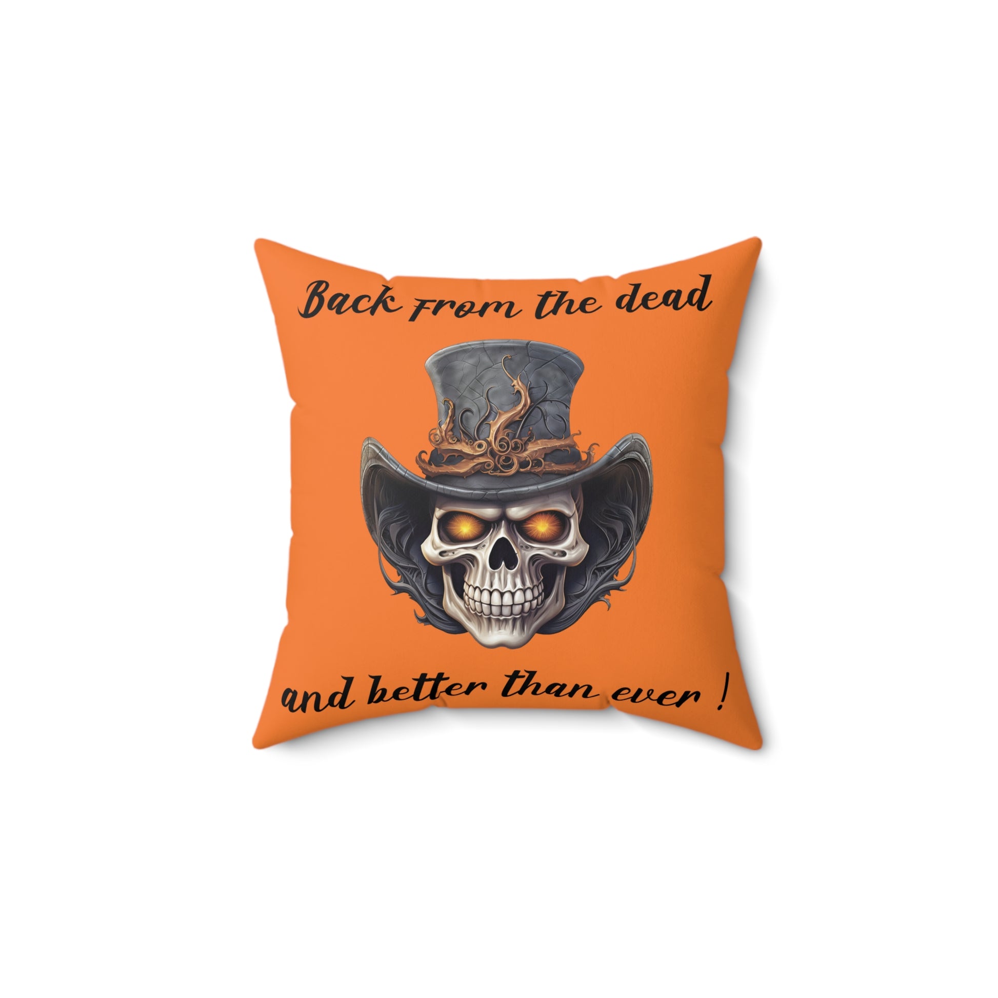 Add a splash of quirky charm and vibrant personality to your space with this delightful square pillow, exclusively available at www.lynnsalemcreates.com. Crafted to catch the eye and spark a smile, this pillow features a bold, custom-designed front showcasing a playful smiling skull wearing a stylish blackish hat, complete with bright, expressive eyes that seem to twinkle with mischief. Just above the skull, the daring phrase "Back From the Dead" makes a fun statement, while below, the cheerful words "and better than ever!" are elegantly displayed in a striking black font, adding a touch of humor and attitude.