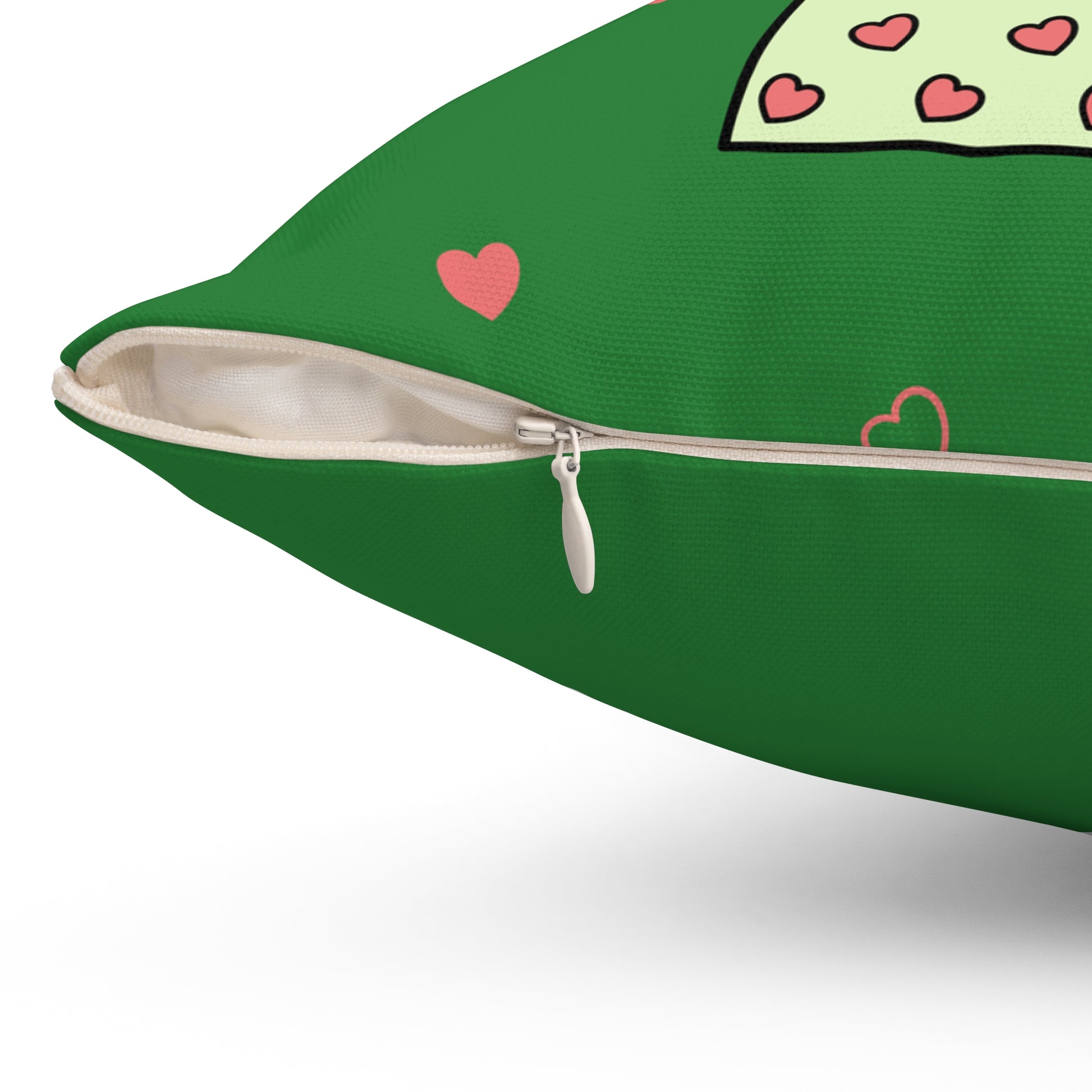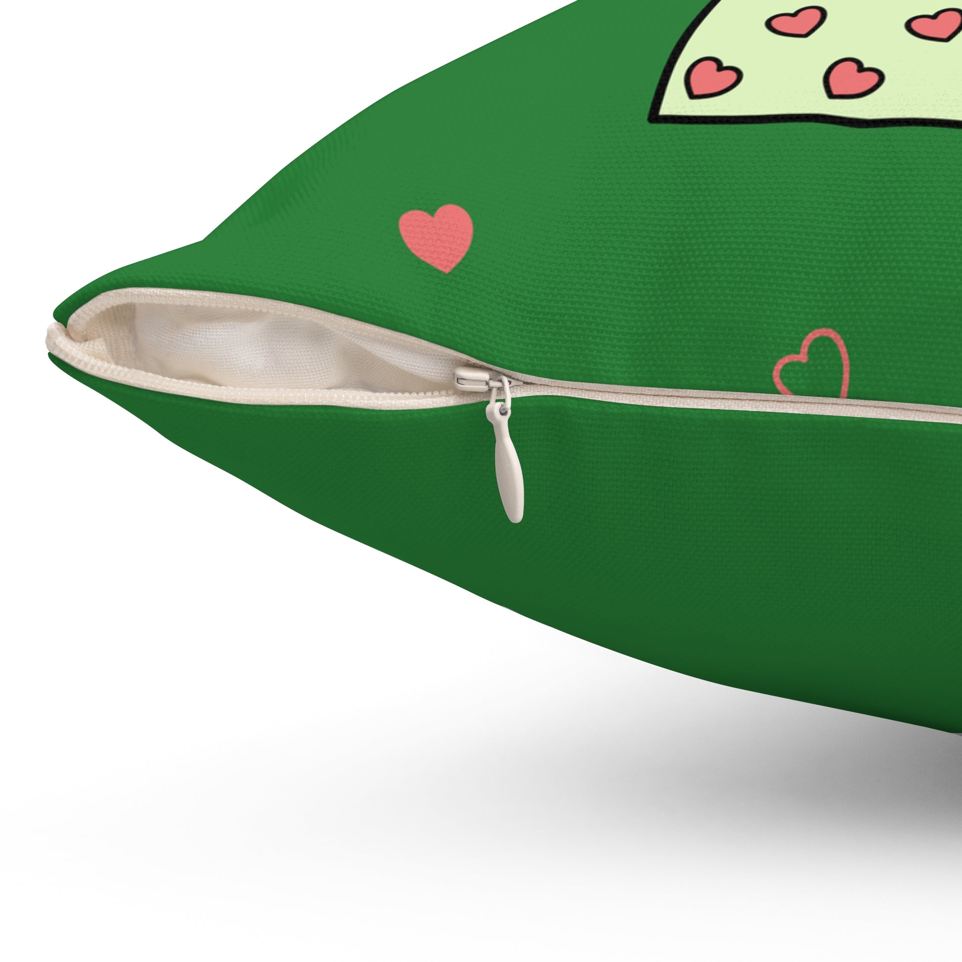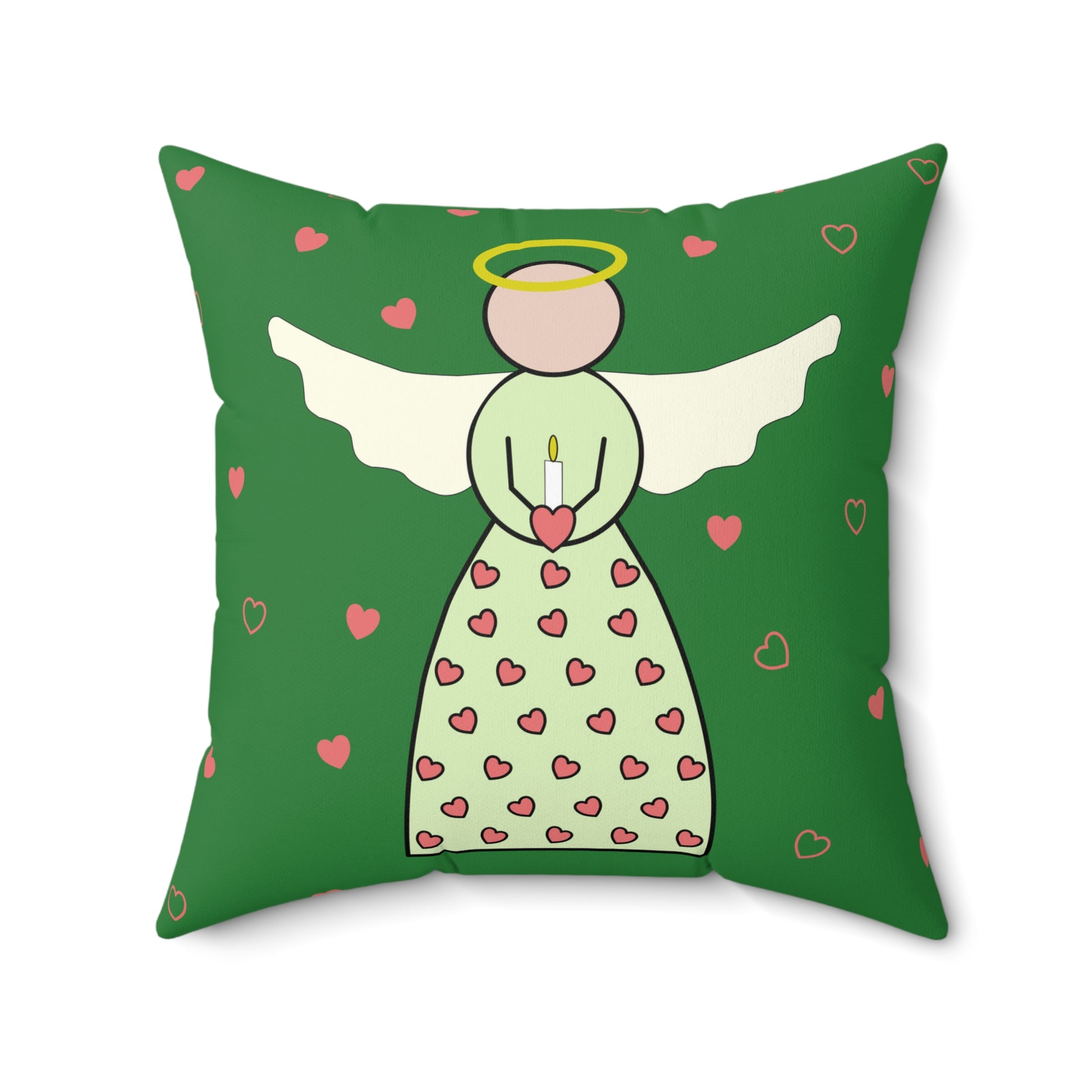 Elevate your home decor with my custom-designed square pillows by Lynn Salem Creates! Available in four sizes—14, 16, 18, and 20 inches—these charming pillows feature a whimsical angel adorned in a light green dress, beautifully embellished with a skirt of red hearts. The angel gracefully holds a white candle nestled in a red heart-shaped holder, surrounded by a playful assortment of red hearts on a darker green background—some solid, some outlined.