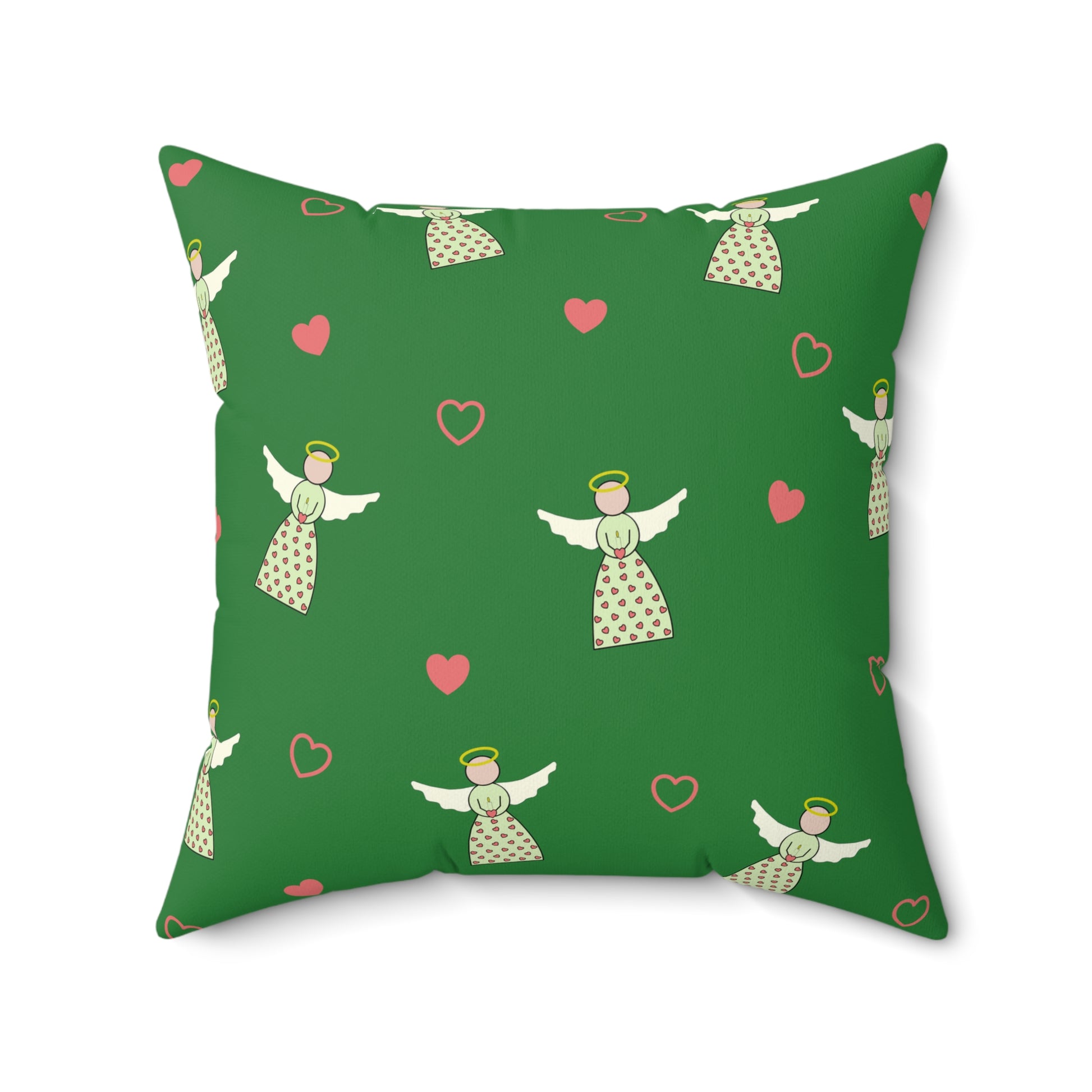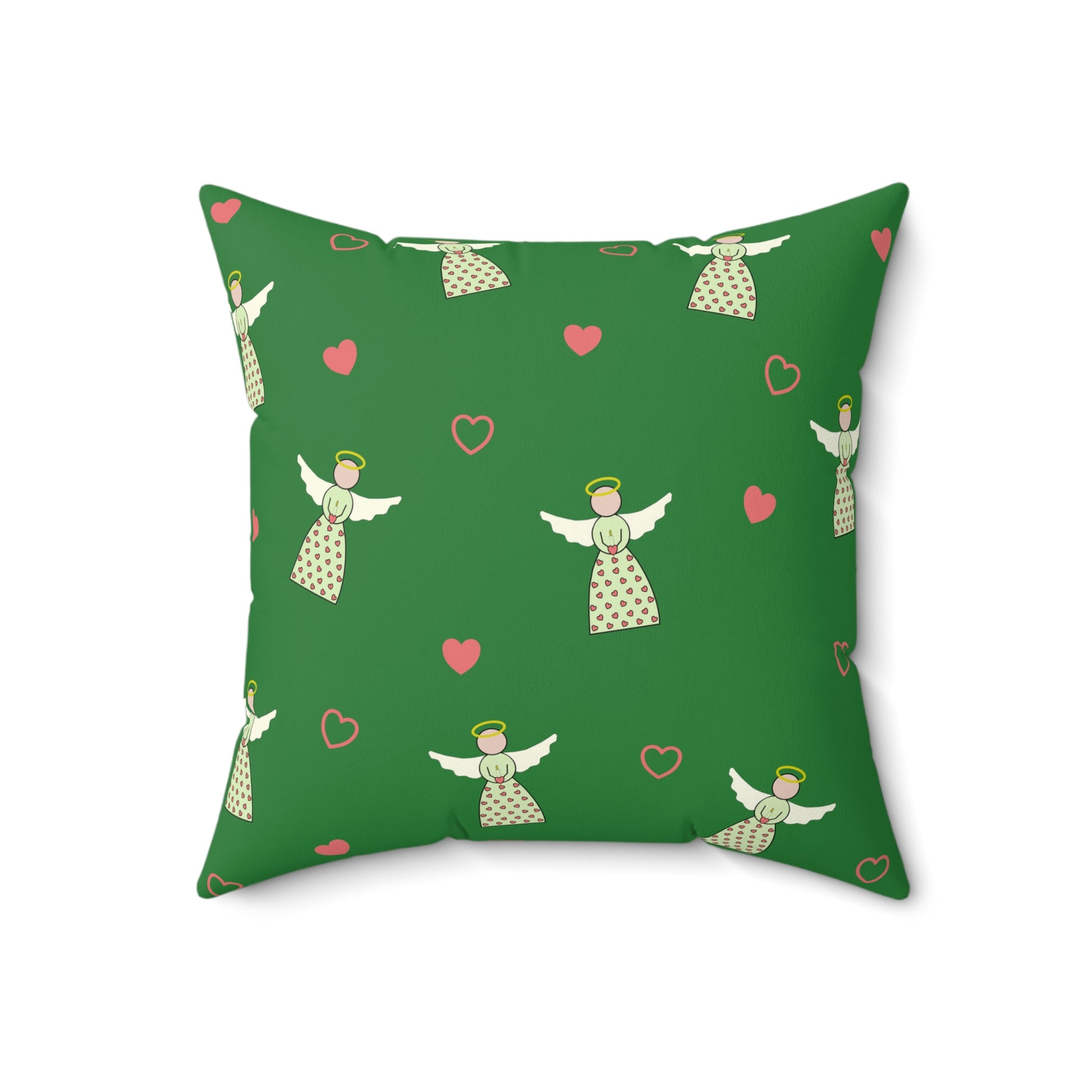 Add a touch of whimsy and warmth to your home with my beautifully crafted square pillows, available in four sizes: 14, 16, 18, and 20 inches. Each pillow features a charming pattern of delightful angels dressed in soft light green attire, adorned with red hearts on their skirts. These serene angels, tenderly holding white candles nestled in heart-shaped red holders, are surrounded by a sprinkle of red hearts—some solid, others outlined—set against a rich, darker green background.