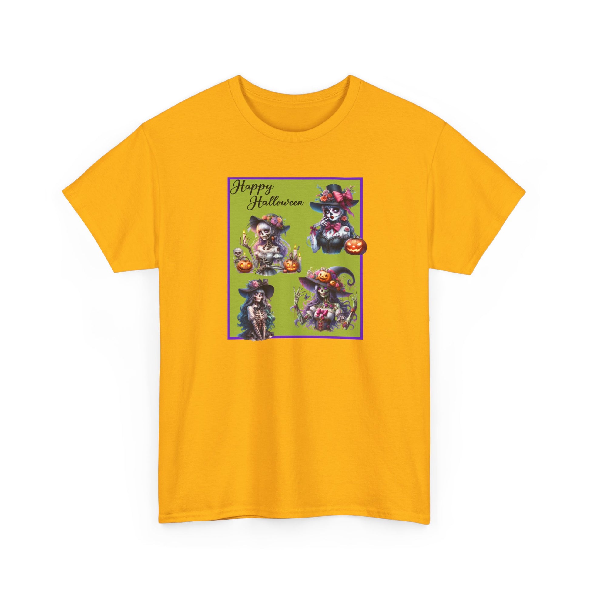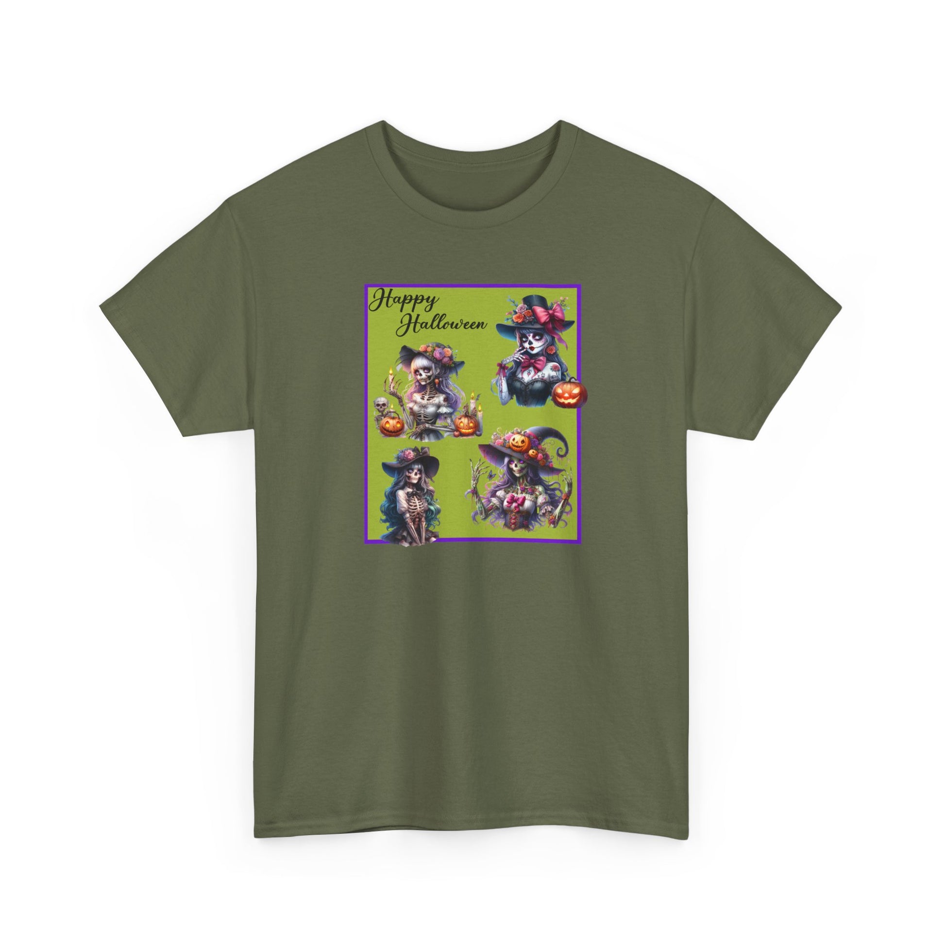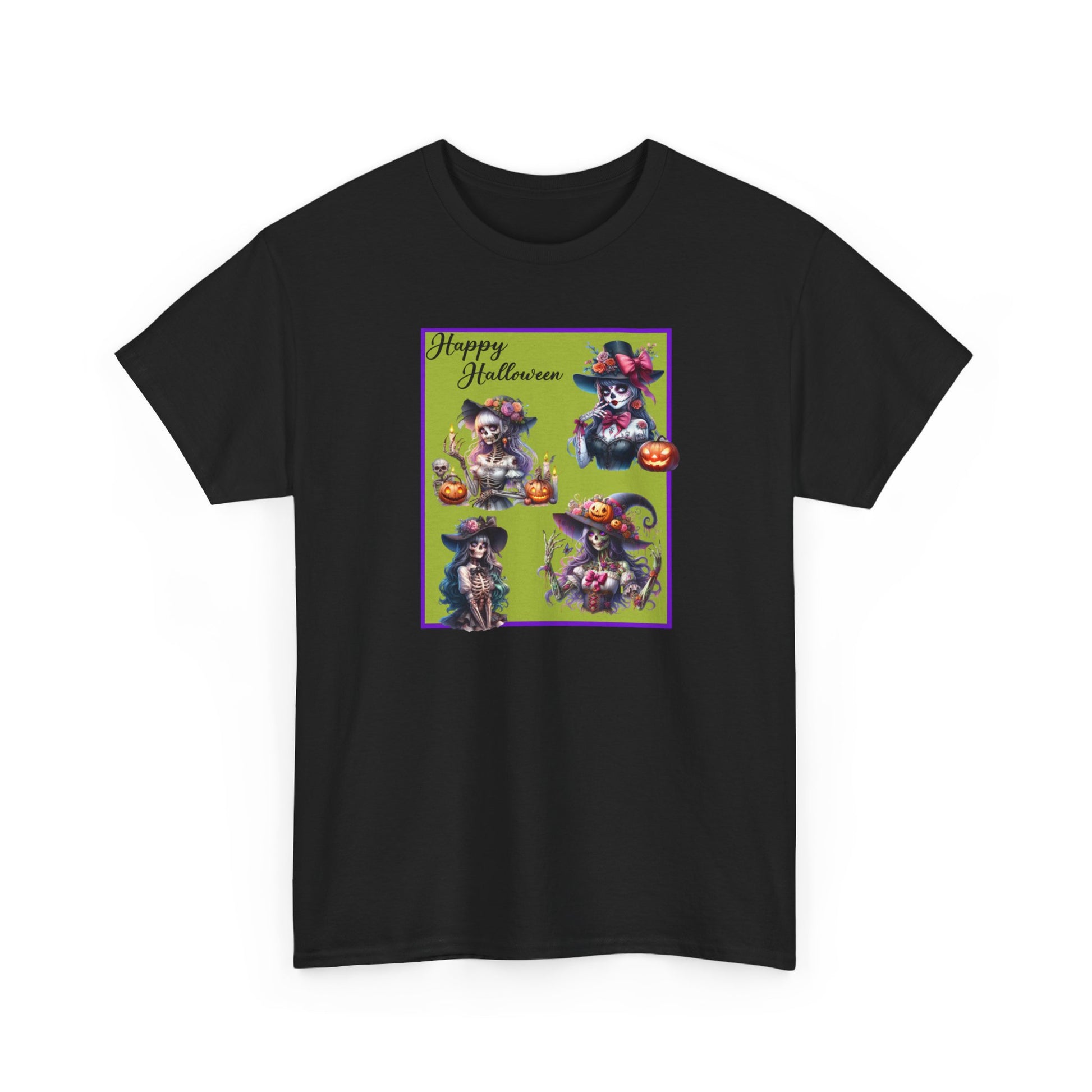 Celebrate the spooky season in style with my custom-designed Halloween unisex t-shirt, available in a variety of colors and sizes to suit everyone. This eye-catching design features a mossy green rectangle outlined in a vibrant purple, serving as the backdrop for four uniquely styled lady skeleton busts. Each skeleton showcases her own distinct personality, elegantly adorned with playful hats embellished with flowers, ribbons, and charming pumpkins. The perfect blend of whimsical and fashionable, this design, by Lynn Salem Creates, is sure to make a statement. To complete the look, the upper left corner proudly displays the festive greeting "Happy Halloween" in a stylish black script. Whether you're at a Halloween party or simply embracing the spirit of the season, this t-shirt is a must-have addition to your wardrobe.
