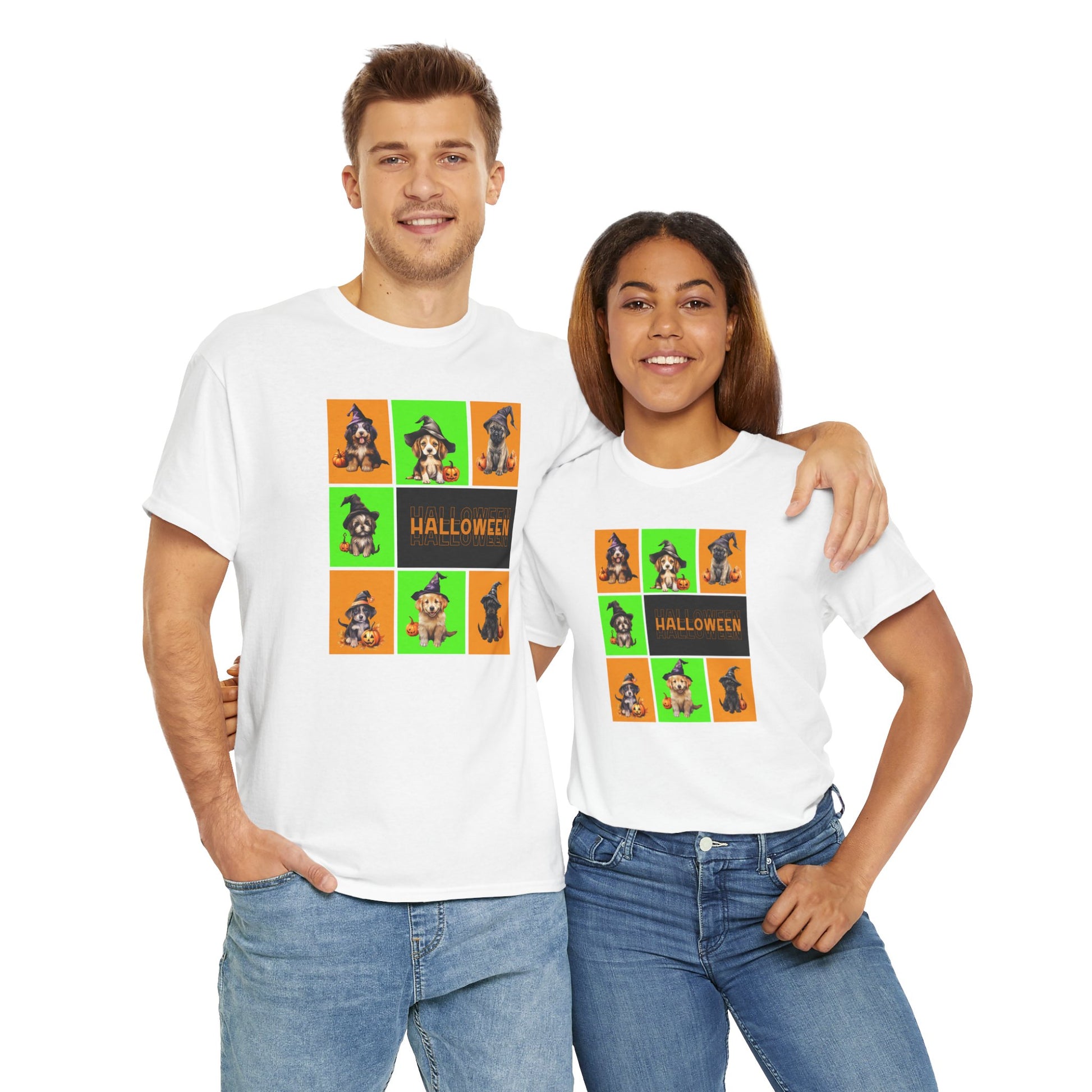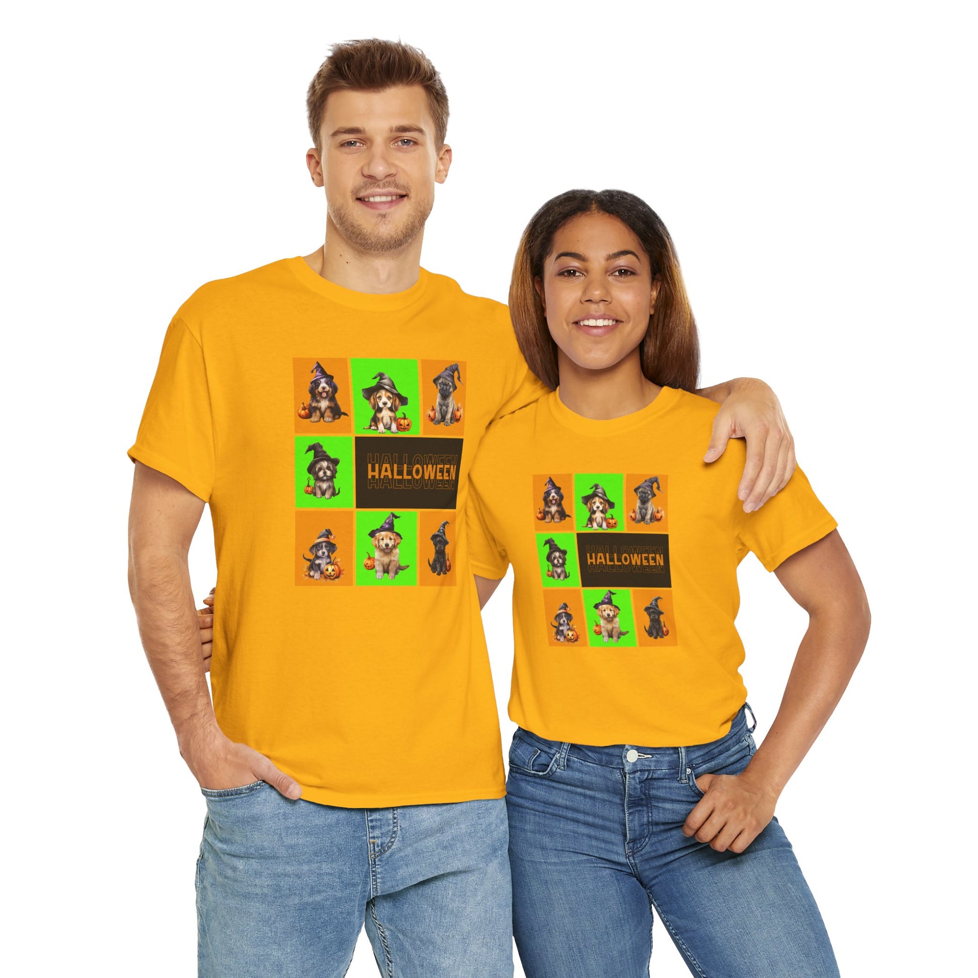 Elevate your Halloween style with my custom-designed unisex t-shirt, perfect for dog lovers who want to celebrate the holiday in a fun and stylish way. This unique shirt features an adorable array of seven playful puppies, each wearing whimsical witches hats and surrounded by festive pumpkins, all artfully arranged within a rectangular shape. The design is accentuated by a bold three-tiered text reading "HALLOWEEN" in a vibrant orange hue, positioned centrally and extending gracefully to the right side of the rectangle. Available in a variety of colors and sizes, this tee promises a comfortable and flattering fit for everyone. Embrace the spooky season while showcasing your love for furry friends with this charming Halloween t-shirt! Order today for yourself or a gift for a dog lover.