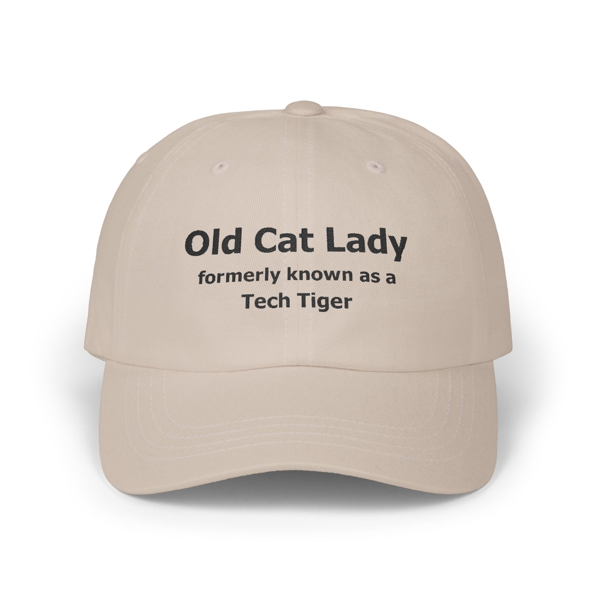 Introducing the exclusive embroidered hat, only available at Lynn Salem Creates. This stylish cap features a custom design with the bold black text: Old Cat Lady formerly known as a Tech Tiger, adding a fun and personalized touch to your wardrobe. Crafted from 100% cotton, it offers a soft, breathable feel perfect for all-day comfort.
