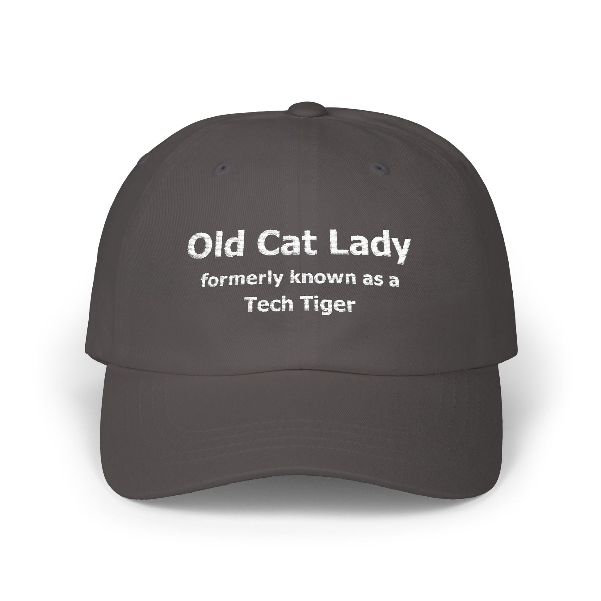 Introducing the exclusive embroidered hat, only available at Lynn Salem Creates. This stylish cap features a custom design with the bold white text: Old Cat Lady formerly known as a Tech Tiger, adding a fun and personalized touch to your wardrobe. Crafted from 100% cotton, it offers a soft, breathable feel perfect for all-day comfort.